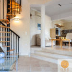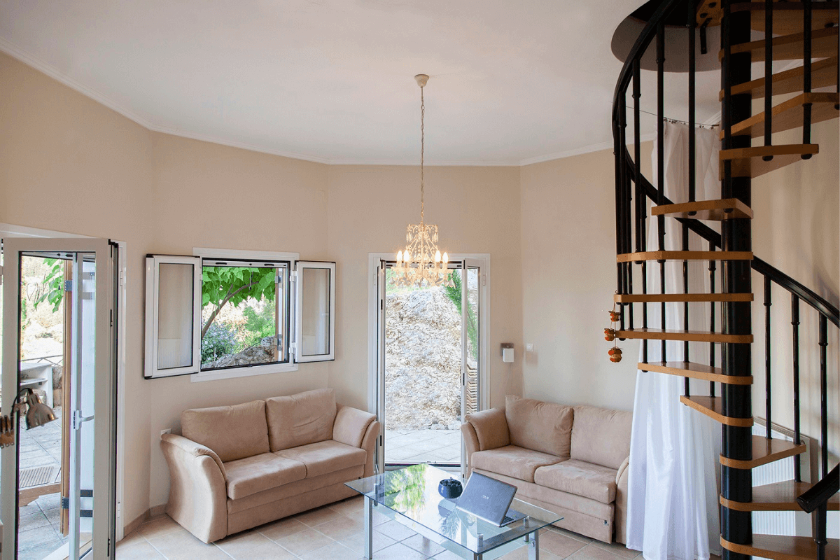 מדרגות מפינת הישיבה מובילות לחדר שינה זוגי נוסף