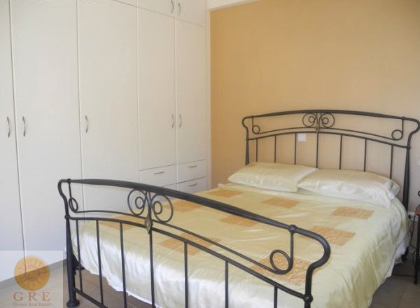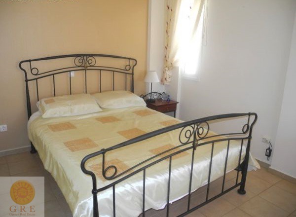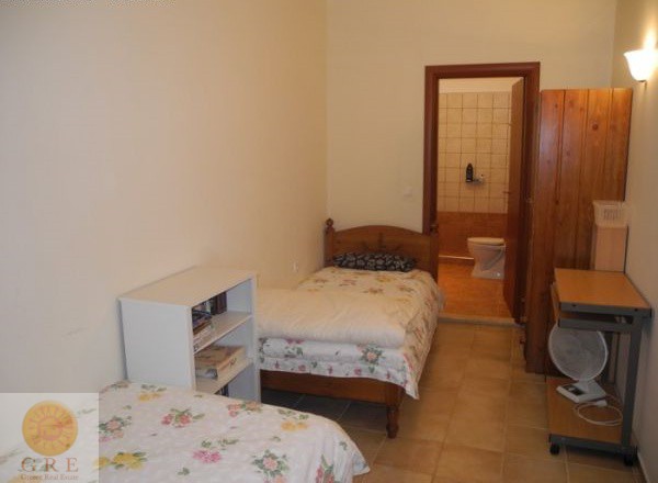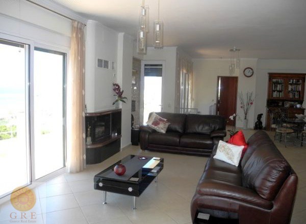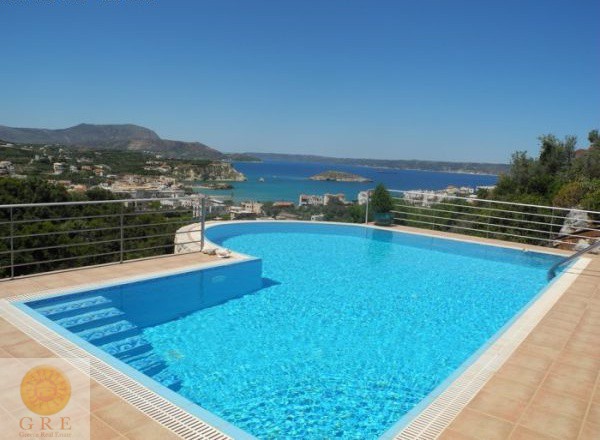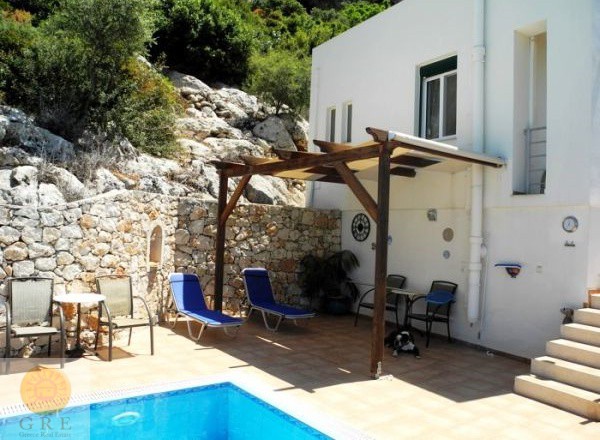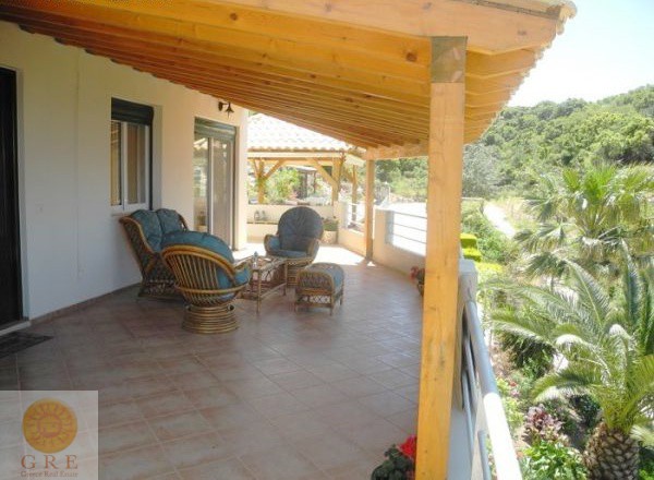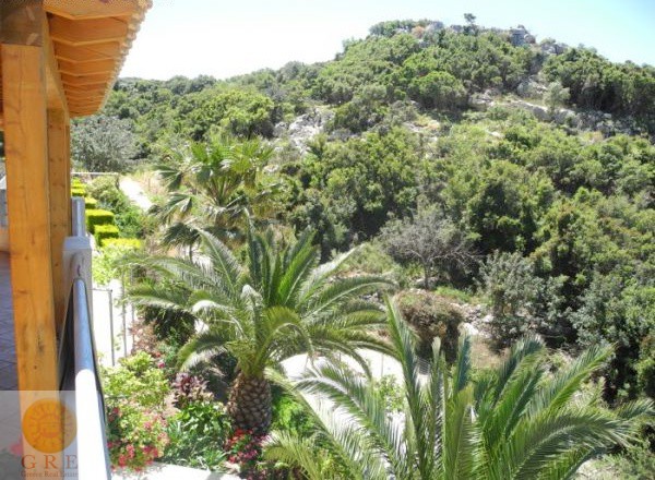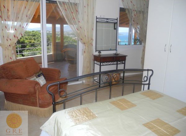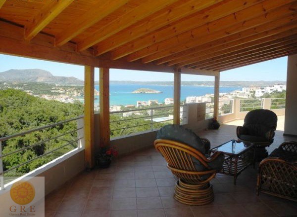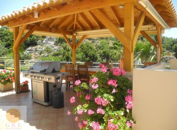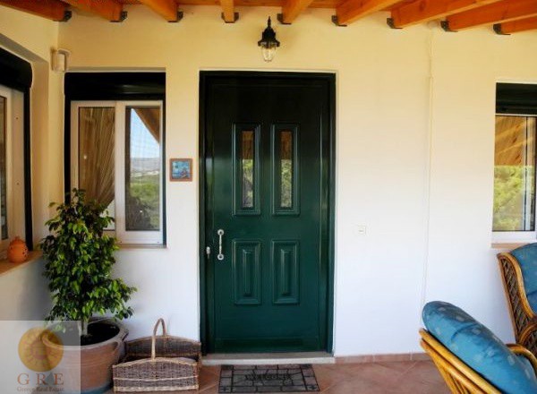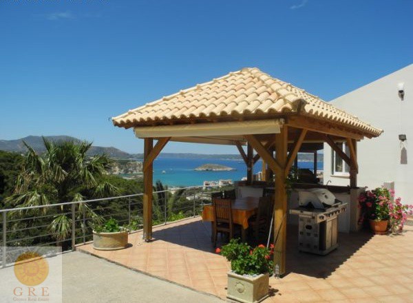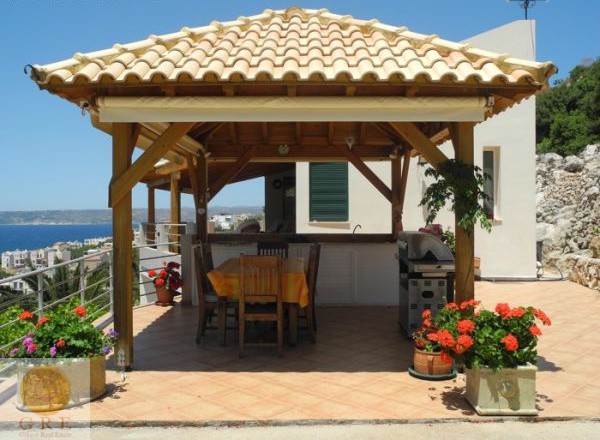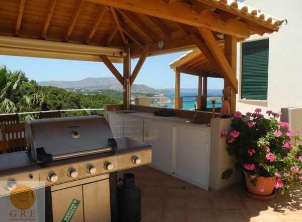 דלתות הזזה מחדר השינה השני והסלון נפתחות אל המרפסת הגדולה, המכוסה פרגולה, המשקיפה אל מפרץ סודה (Souda Bay), מעל גגות הכפר הציוריים של אלמירידה (Almirida).