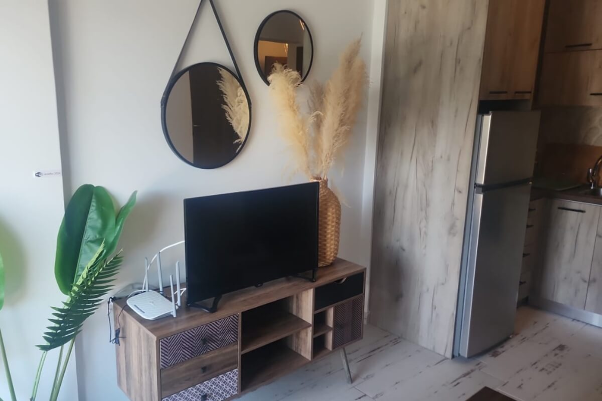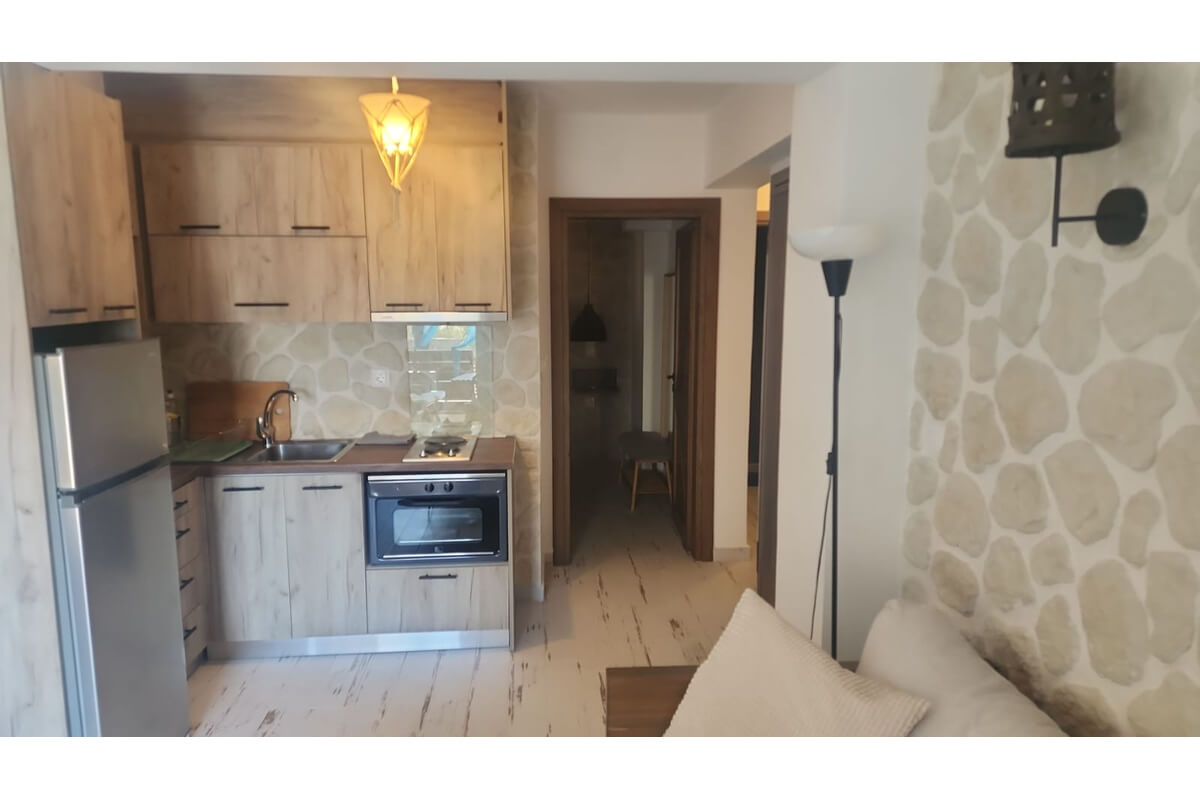 בדירה חדר שינה אחד, חדר רחצה ושירותים, מטבח מאובזר, סלון ומרפסת עם אזור ישיבה בבריכה.