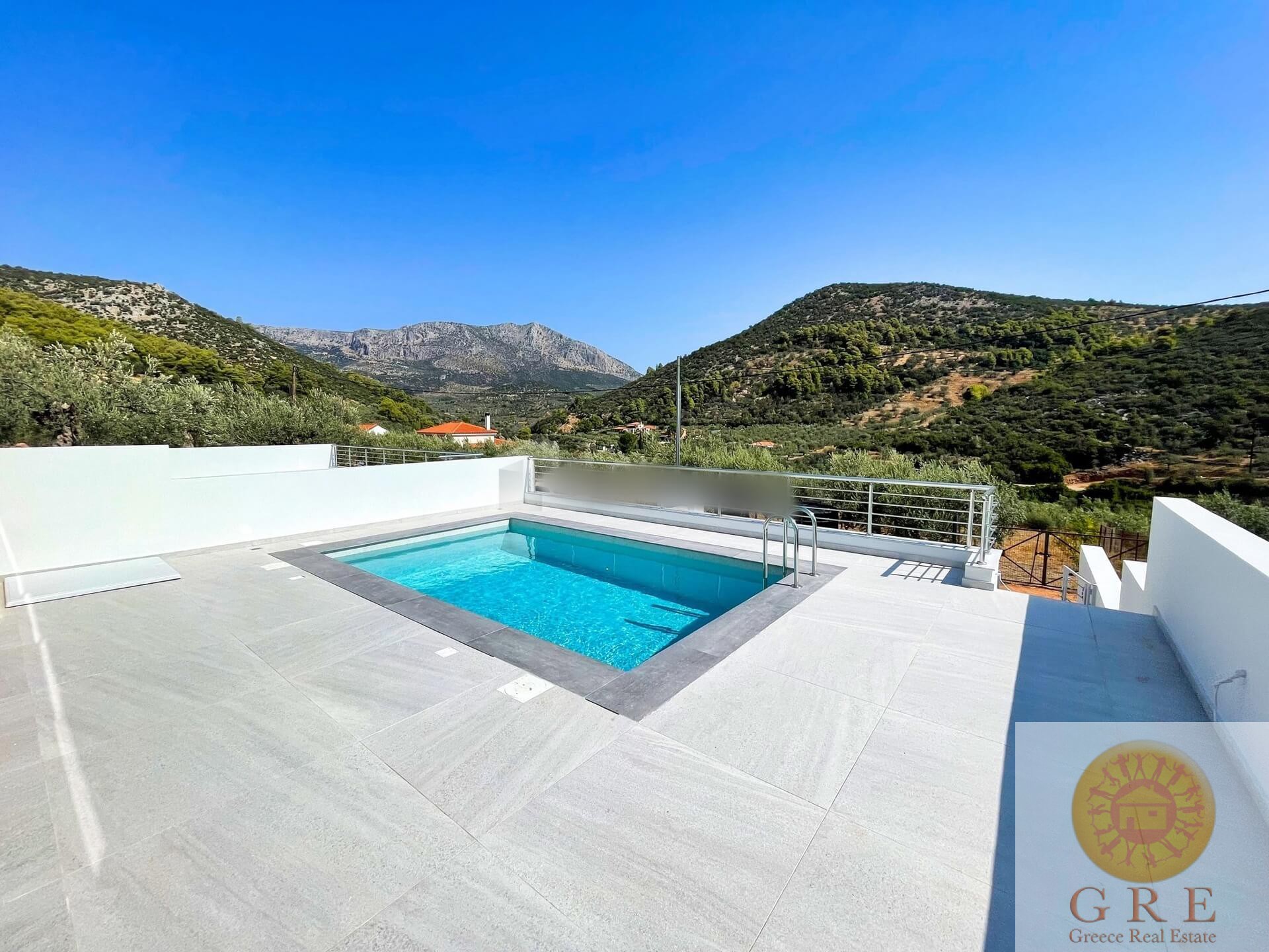 בריכת שחיה , גינה עם עצים, סלון עם אח, מטבח, 3 חדרי שינה וחדר רחצה עם שירותים אחד צמוד.