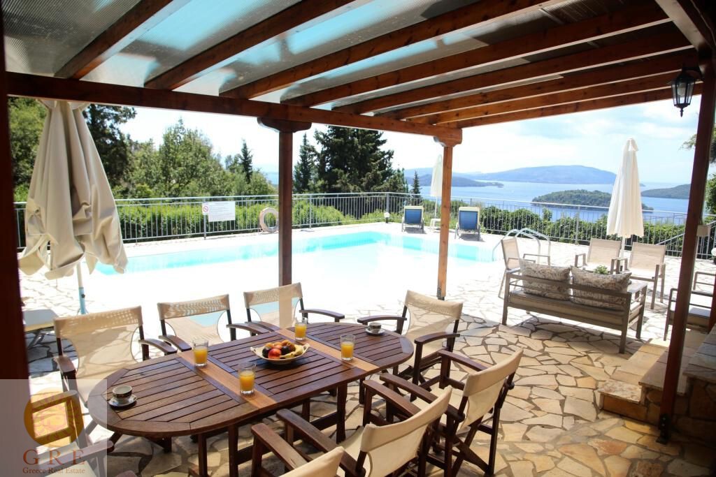 חלונות צרפתיים המובילים לטרסת הבריכה, פטיו מרווח מאוד המשקיף על בריכת השחייה עם שולחן אוכל ל -10 אנשים.
