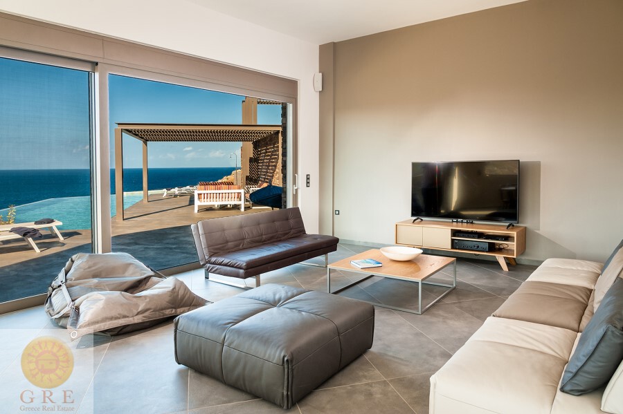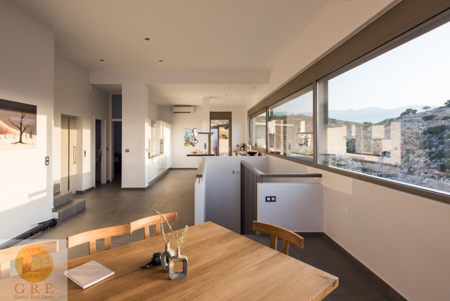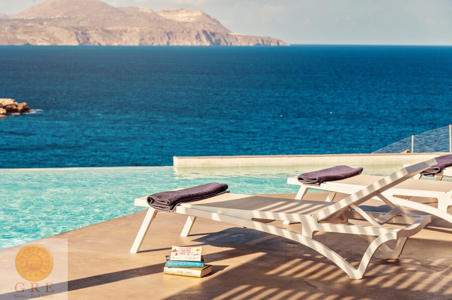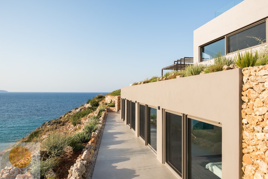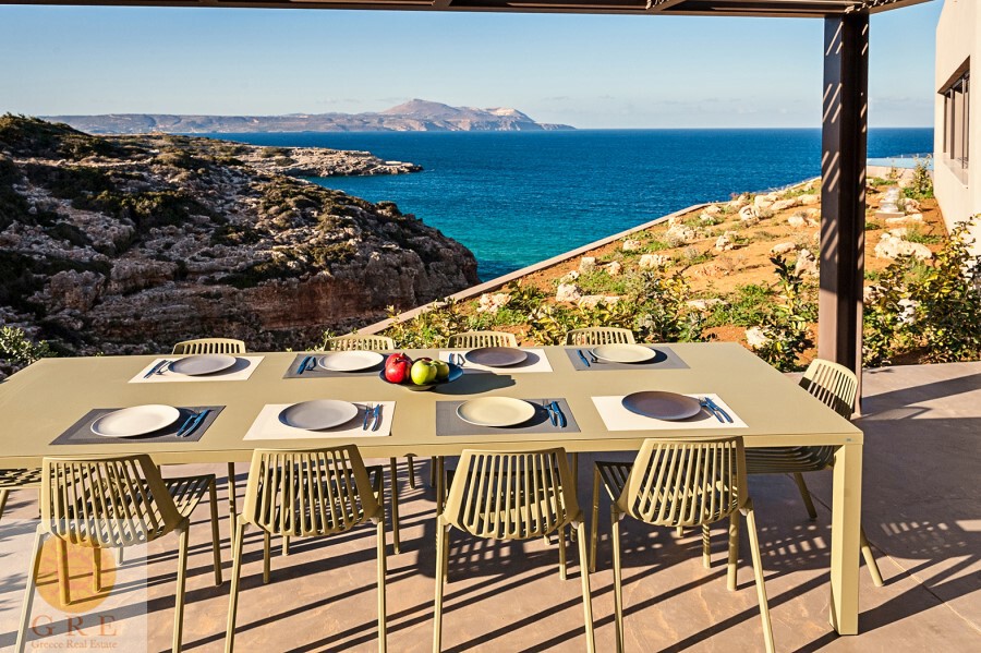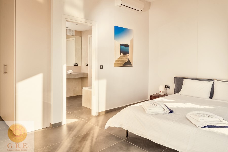 חדר הרחצה הראשי בקומת הכניסה כולל טרסה משלו עם מיטות שיזוף המציעות נופים מרהיבים של הים של כרתים וחצי האי אקרוטירי.