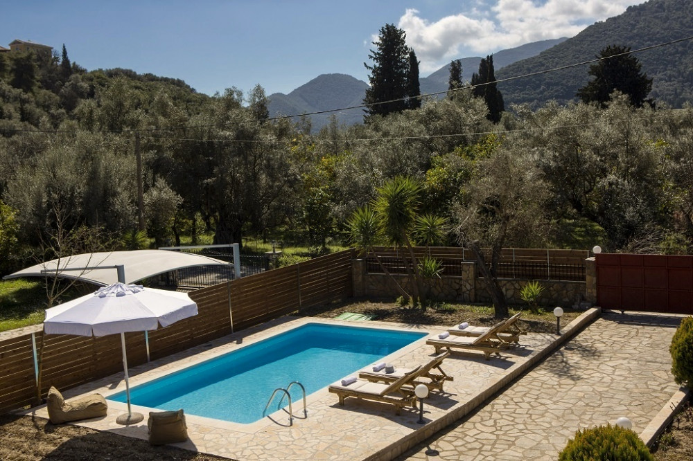 וילה דו-מפלסית עם בריכת שחייה, מוקפת בצמחייה שופעת בשכונה שקטה באזור נידרי.