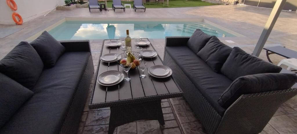 החלקים החיצוניים כוללים מתקני ברביקיו הבנויים מאבן, תנור פיצה עצים ומרפסת מקורה עם פרגולה בצד הקדמי של הוילה; המקום המושלם ליהנות מארוחות ומפגשים משפחתיים.