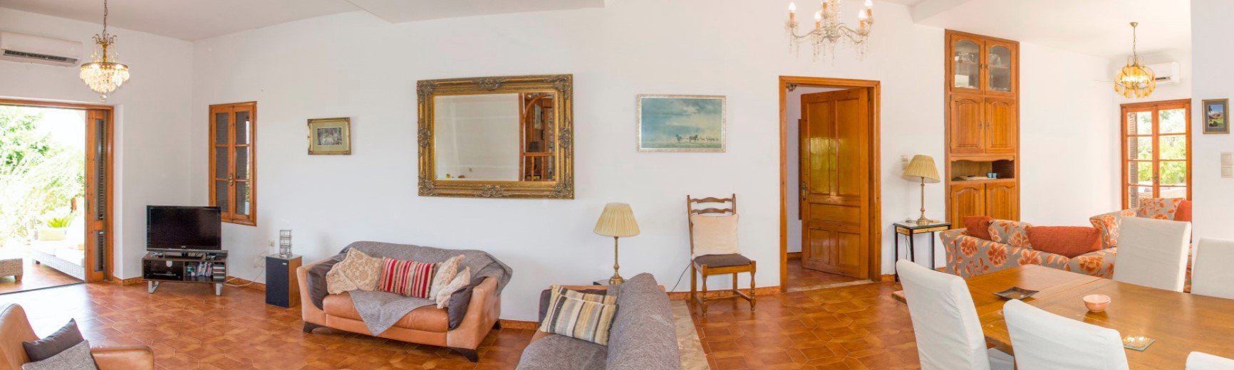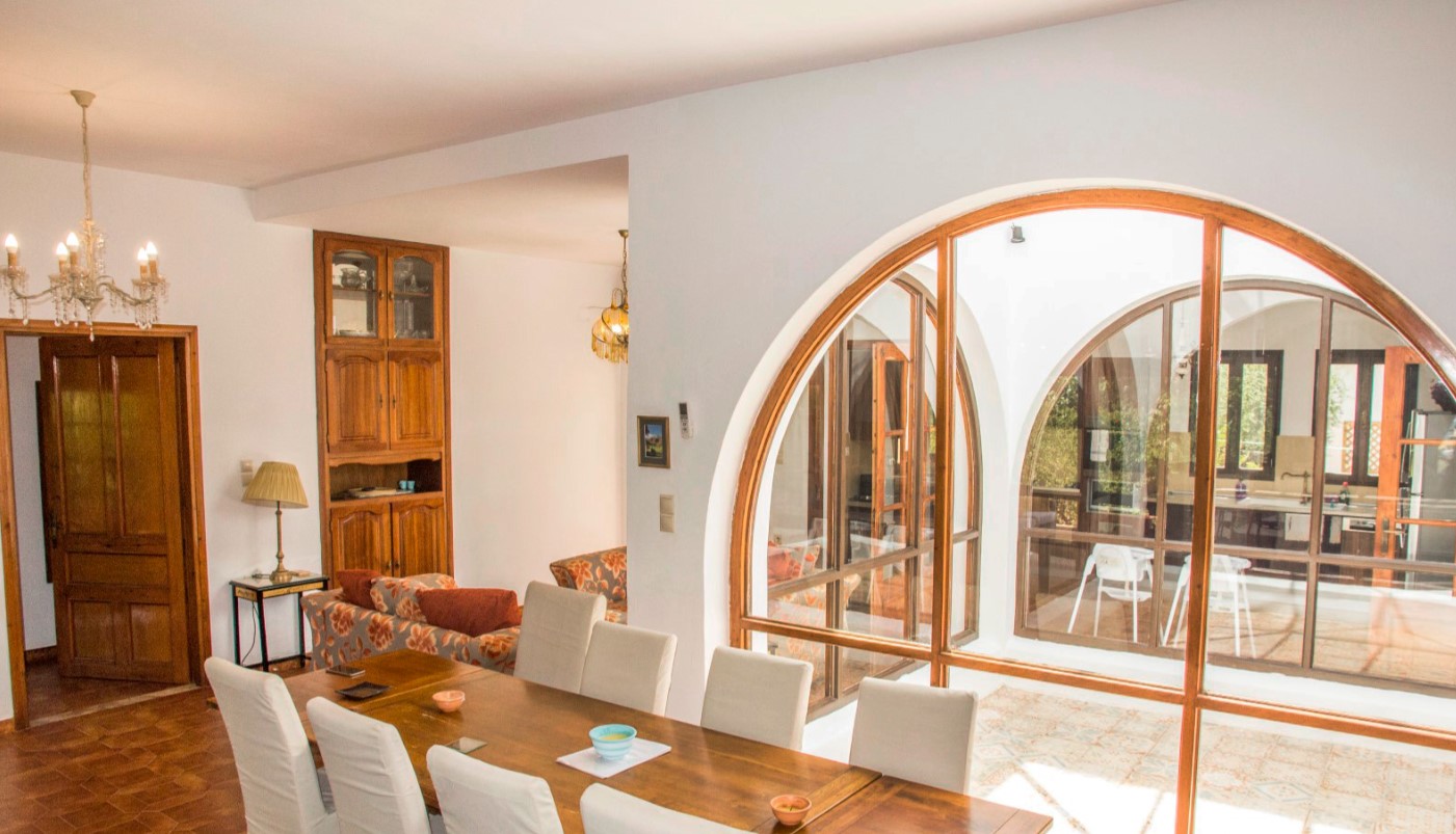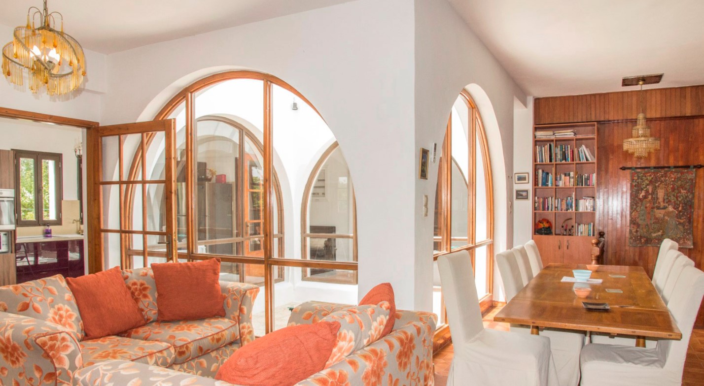 הטרקלין המפוצל מורכב מ-2 חלקים, אזור ספות במפלס התחתון ואזור מפלס עליון עם שולחן האוכל. השטח התחתון מצויד באח ויחידת מיזוג אוויר. דלתות פטיו הזזה גדולות נפתחות אל המרפסת המקורה המקושתת, אידיאליות למגורים בחוץ, גישה לגינה ונהנית מנוף נהדר של הים.