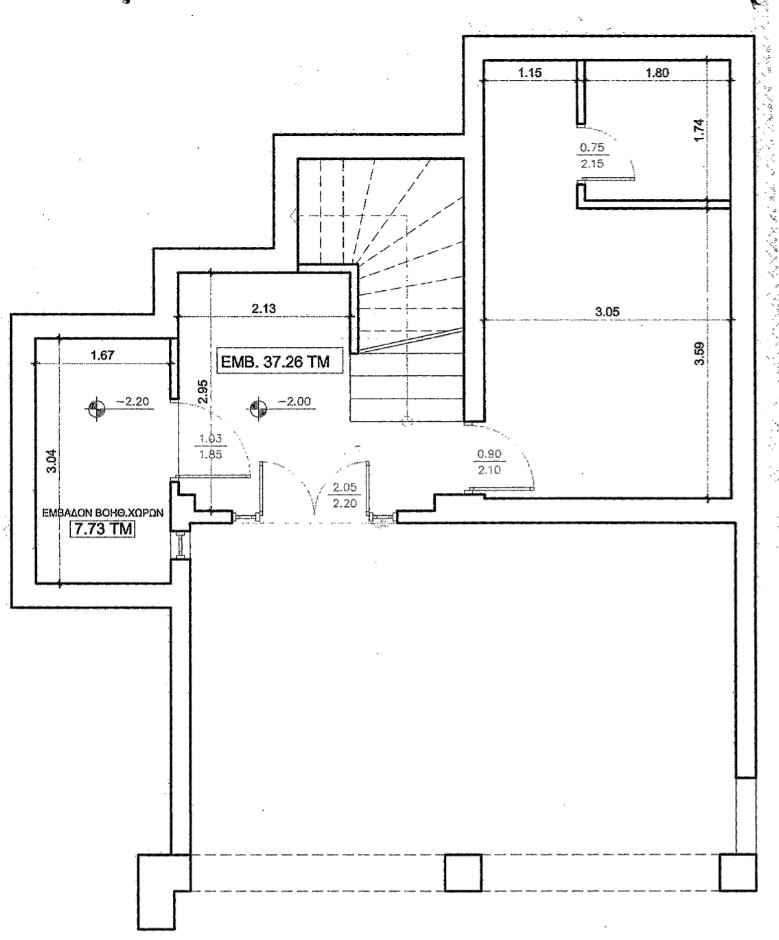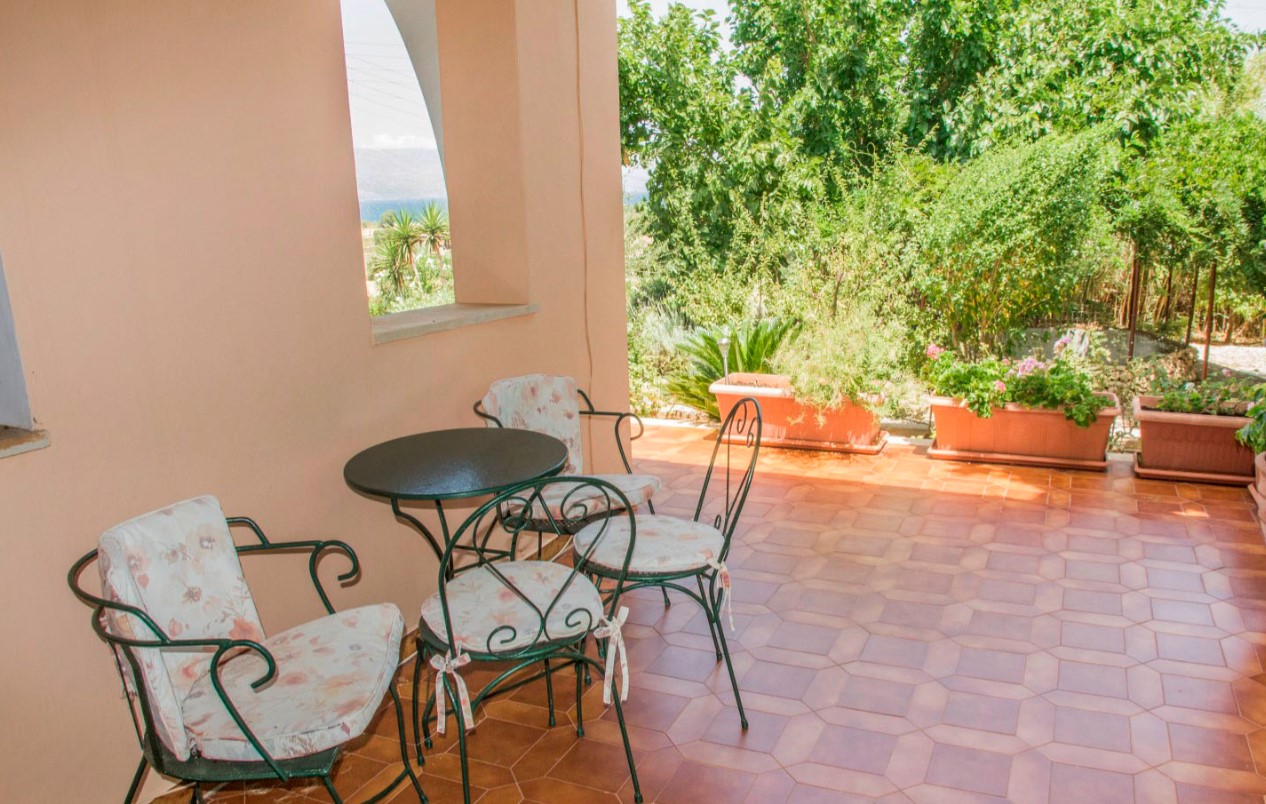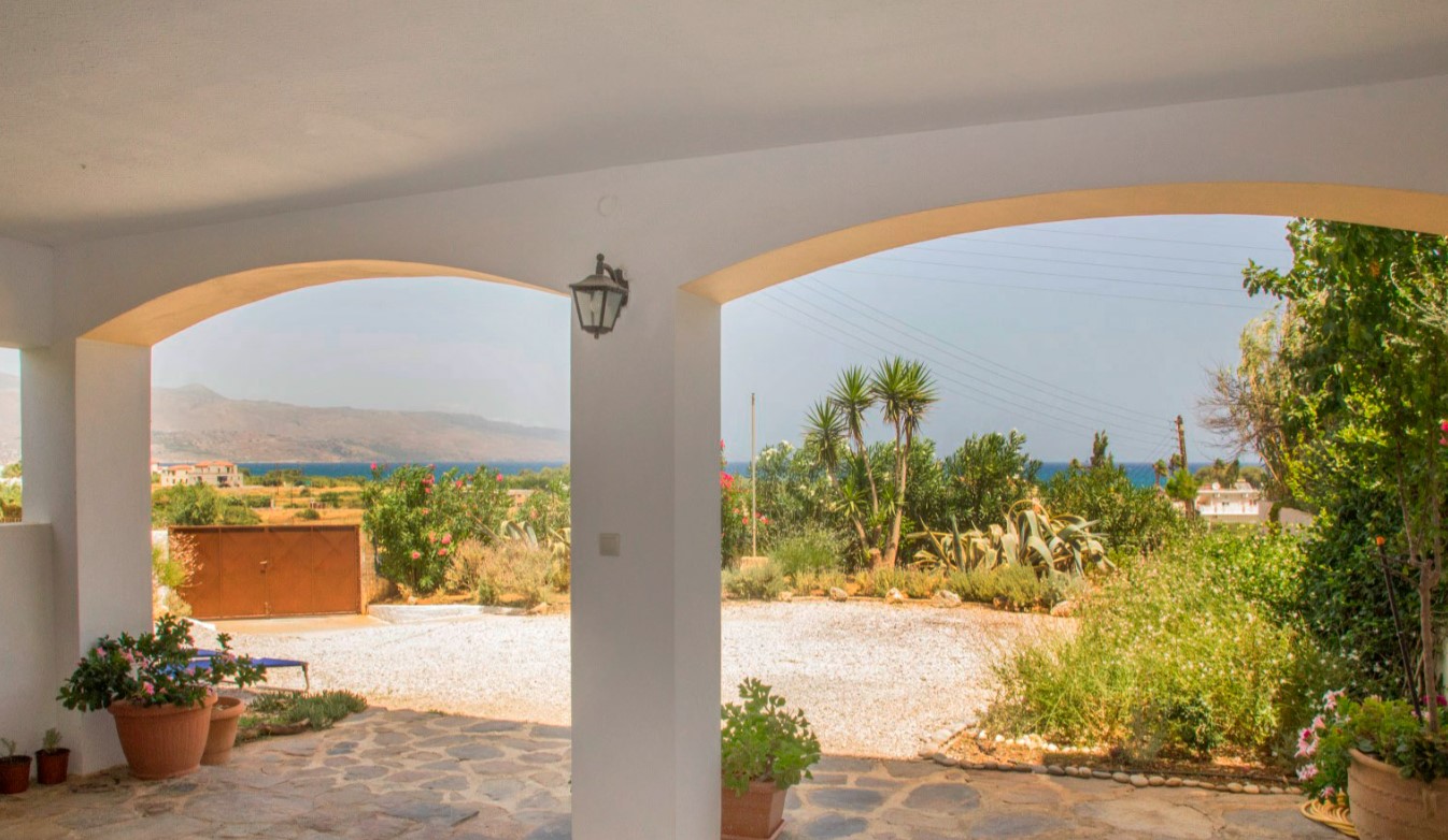 בחוץ: שער מתכת נפתח למגרש, שביל כניסה גדול ושטח חלוקי הנחל עם חניה בשפע. הכניסה הראשית מוגנת במרפסת גדולה מקורה ומקושתת ושטח מרוצף אבן בו ניתן היה להתקין ריהוט חוץ.
