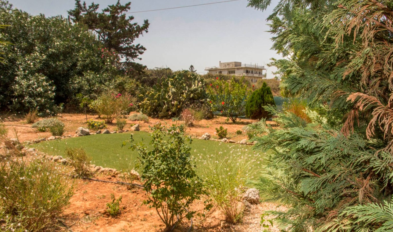 המגרש כולו מגודר, מוקף חומה ומטופח. הגינה עוטפת את הבית ומורכבת משבילים קטנים, מדשאה קטנה, מתחם מגודר לתרנגולות וארנבות למקרה שרוצים ומגוון פרחים, שיחים ועצים. לחלק האחורי של הבית מבנה אחסון גבוה.