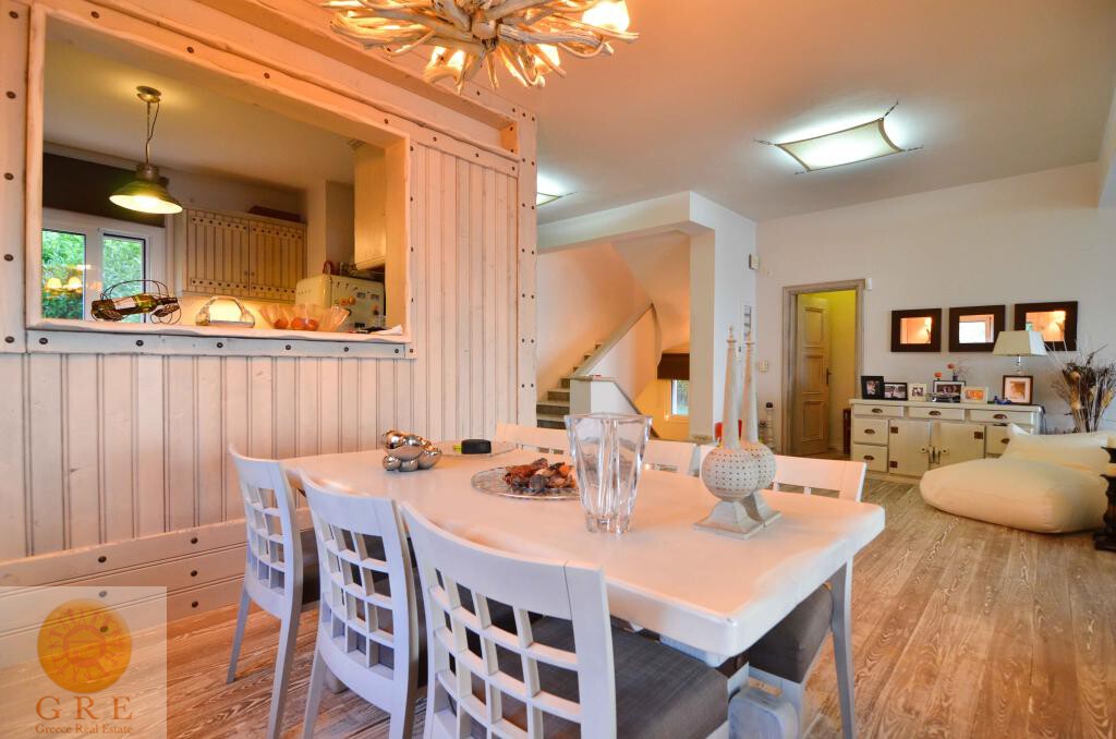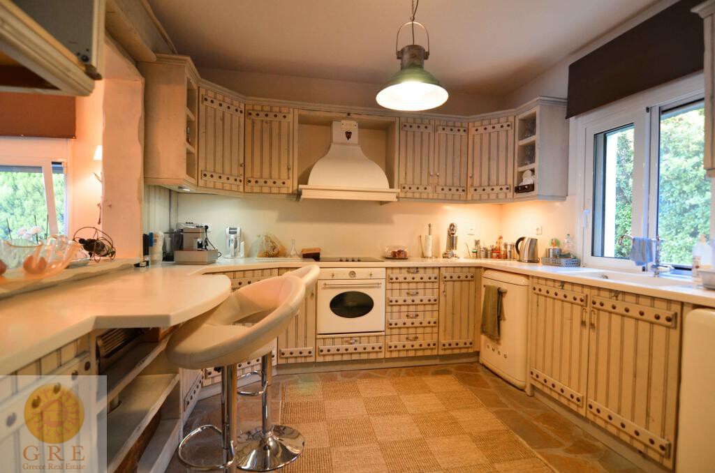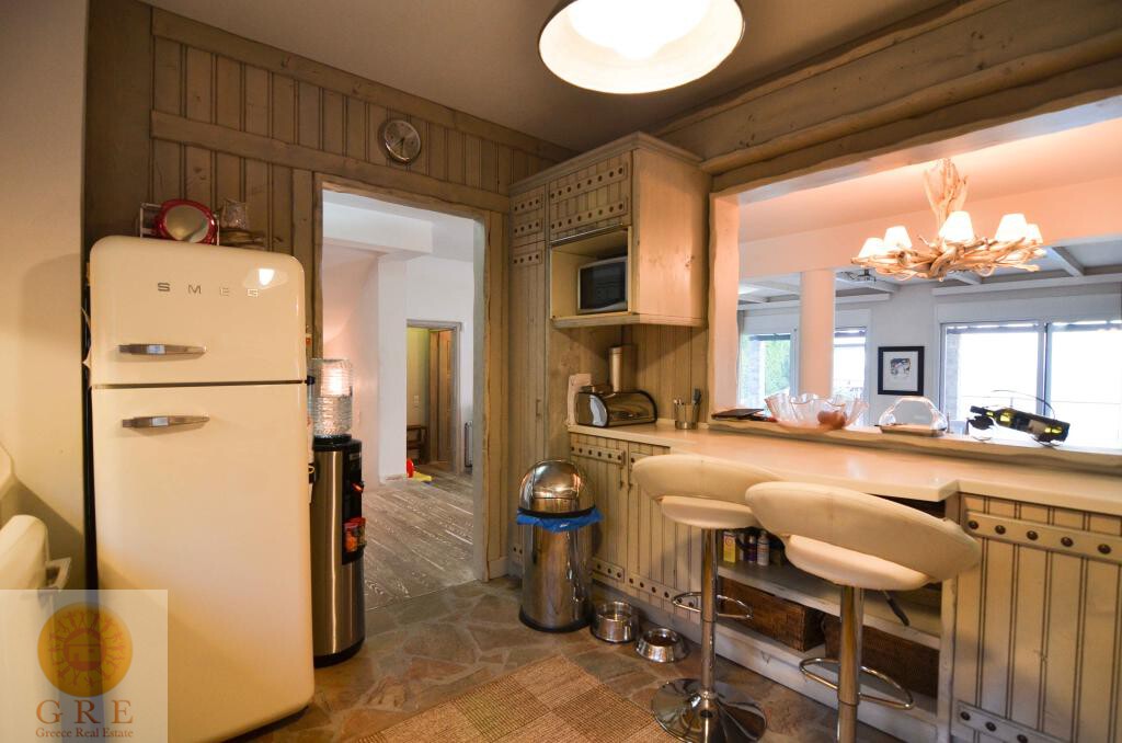 מטבח, פינת אוכל, סלון עם אח המשקיף לבריכה והים.