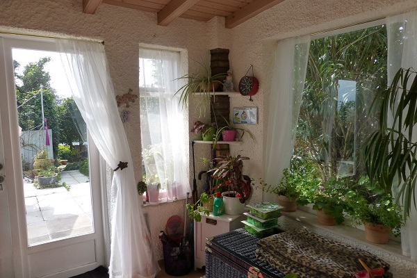בגינה יש עצי פרי, עציצים והתחזוקה שלו נמוכה.
