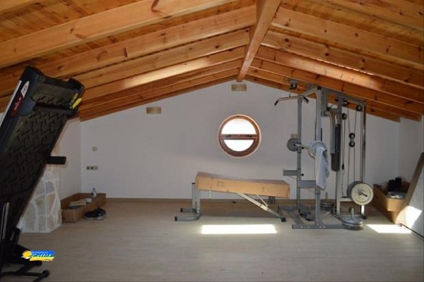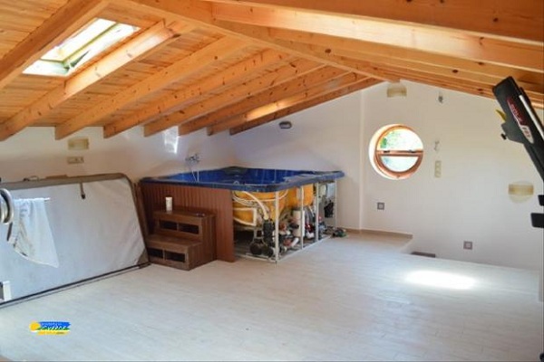 יש גג גדול עם קורות חשופות וג'קוזי משמש גם כמכון כושר.