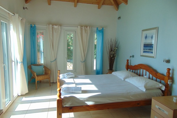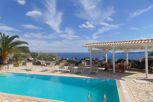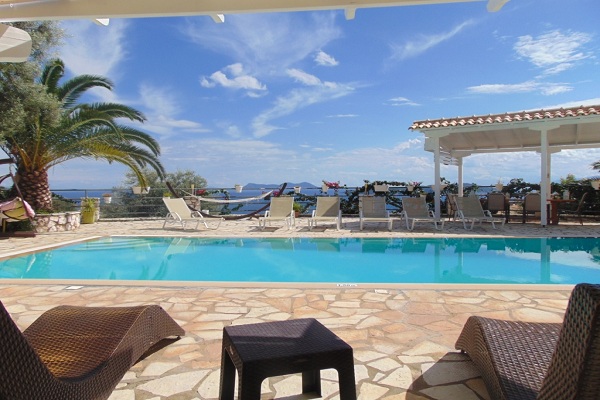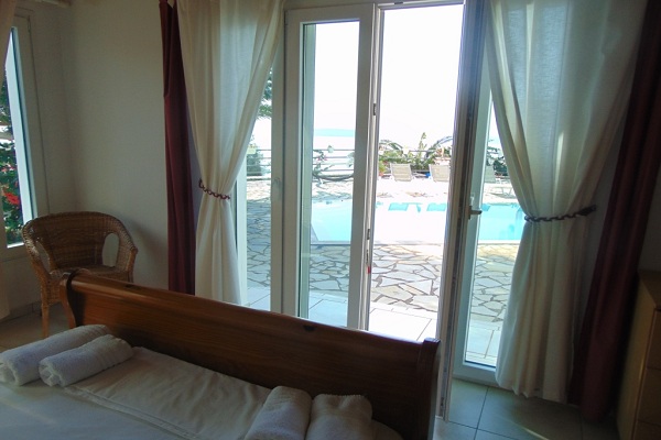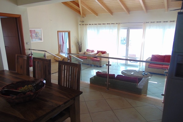 אזור המגורים משקיף על המרפסת, בריכת שחיה של 50 מ"ר והים.
