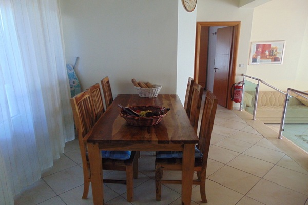 בפינת האוכל יש שולחן אוכל מעץ מלא גדול וכיסאות.