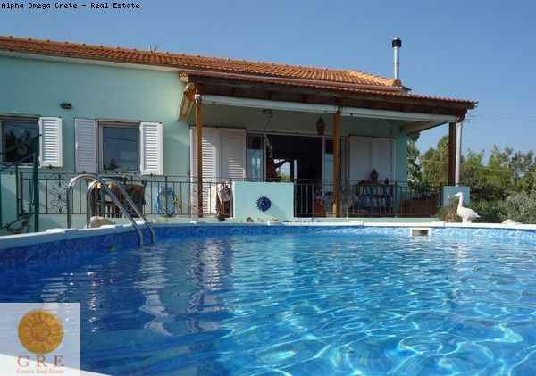 The two bedrooms leading outside by French doors, to a covered terrace area with sea and garden views, and from there to a wide paved staircase to the large roof terrace of 50 sqm, with views of the village, Drafanos hill, the white mountains and Souda bay.